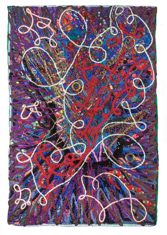 Mixed media including fabric from clothing, costume jewelry, fabric trim and Bias tape hand sewn onto window screen.