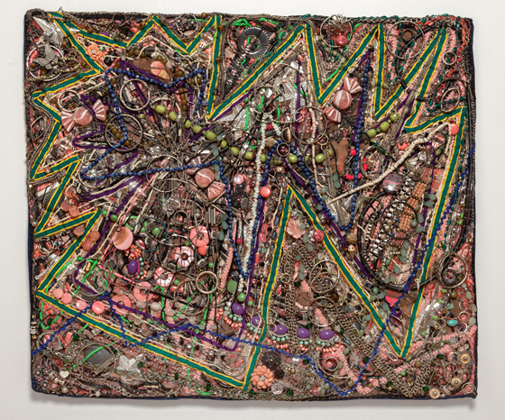 Mixed media including ribbon, lace, costume jewelry, phone chargers, electrical cords, and braid sewn onto plastic rain coat and window screen