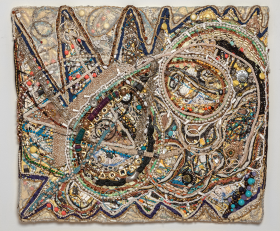 Mixed media including ribbon, lace, costume jewelry, phone chargers, electrical cords, and braid sewn onto plastic rain coat and window screen.