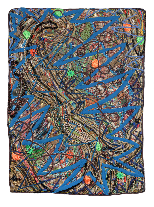 Mixed media including ribbon, rope, plastic toys,costume jewelry, string lights, plastic grapes, phone chargers, hammock, electrical cords, and braid swn onto base of fabric and window screen.