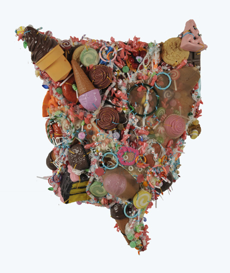 Mixed media consisting of plastic toys (including desserts, barbie doll shoes, candies), bangles, beads, buttons,nylon stockings, doll hair, sewn onto base of fabric and window screen.