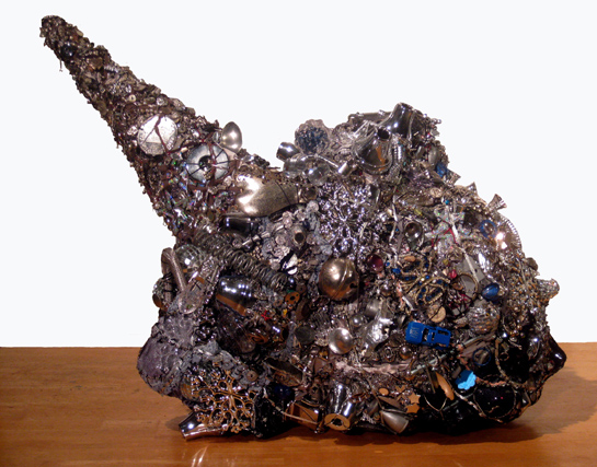 Mixed media including bathroom faucets and handles, charms, Christmas ornaments, buttons, beads, costume jewelry, ribbon, toys, lace, springs, belt buckles, aluminum wire, thread. All objects sewn onto fabric and window screen covering wire armature, stuffed with poly fiber.
