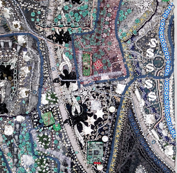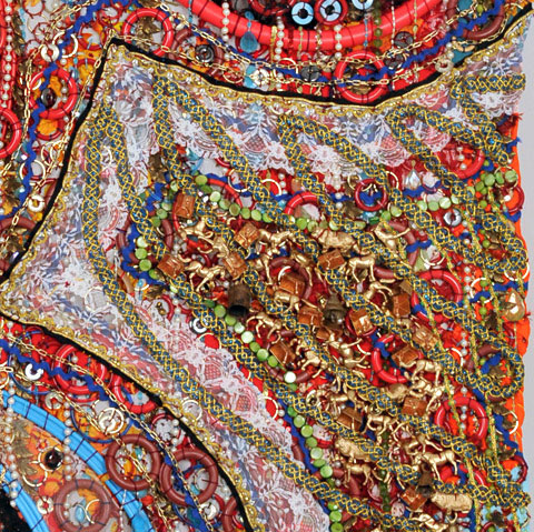Viewing her works from a distance, we might read a quilt, a tapestry, a votive weaving, or a collection of fetishes. Moving closer we see an array of found objects with an abundance of cultural information, a pattern of sutured materials that defy quick categorization. Fabric as fabrication. We're confronted with a kind of sensual materiality that even harkens back to the childhood pleasure of collecting stuff. Buttons, electrical wiring, wood and plastic toys, beads, plastic snakes and lizards, artificial fruit and imitation flowers, humorous kitschy surprises, multiple layers of found fabric and netting, ribbon, and appliqué—all combined in a striking and original variegated materiality. Each work is a scandalous carnival of visual and tactile pleasure, the inverse of so many abject objects filling art spaces in recent years.